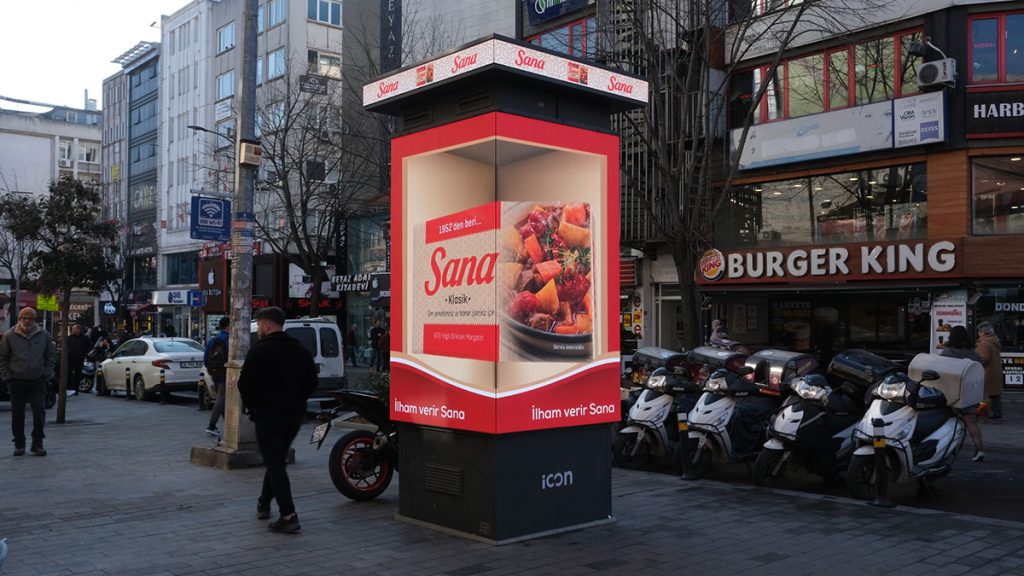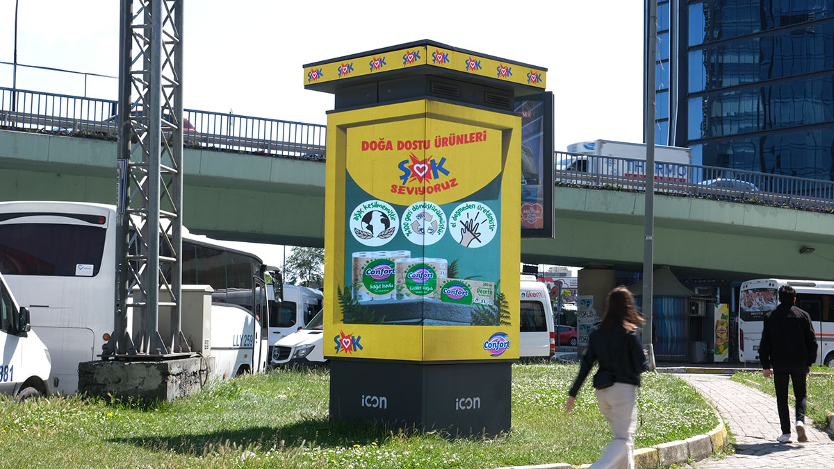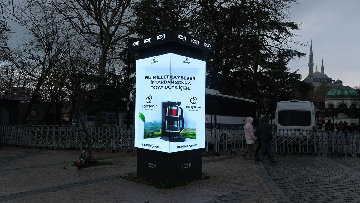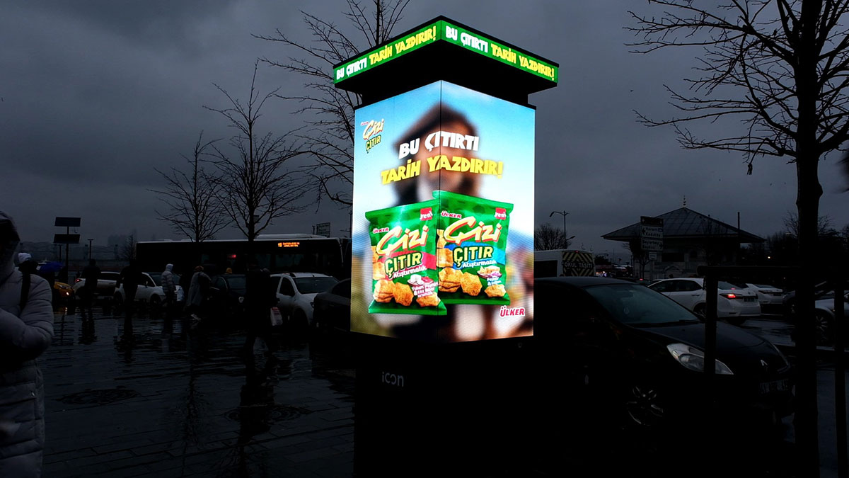 İcon DOOH, İstanbul’un en iyi 40 noktasına konumlanan, son teknoloji donanım ve yazılımla desteklenmiş 4 tarafı led ile donatılmış patentli tasarımı ile dijital açıkhava sektörünün öncüsü konumundadır.
